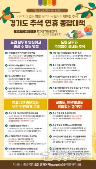 경기도는 먼저 10월 2일이 임시공휴일로 지정됨에 따라 연휴가 시작되는 9월 28일부터 10월 3일까지 6일간 ‘추석 연휴 종합상황실’을 운영해 공백 없이 종합안내와 도민 불편 사항에 즉각적으로 대응할 계획이다.