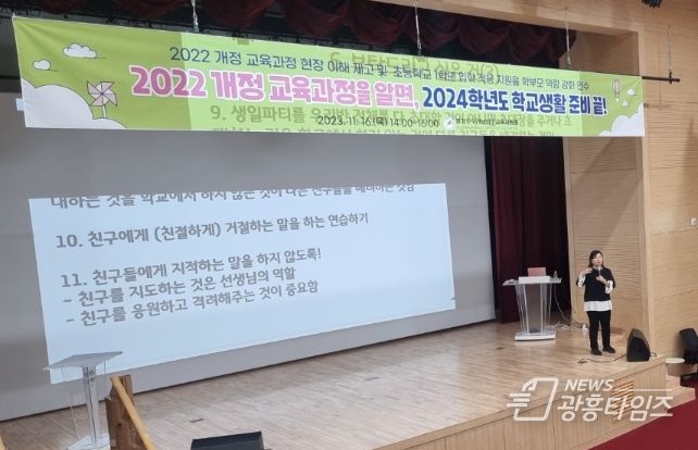연수는 ▲ 2022 개정교육과정 주요 사항 ▲ 1~2학년 개정교육과정 중점개정 사항 ▲ 2024학년도 예비 초등학교 1학년 배움준비 ▲ 친구들과 어울리는 방법 ▲ 부모가 아닌 학부모로서의 대화 방법 ▲질의ㆍ응답 순으로 진행됐다.