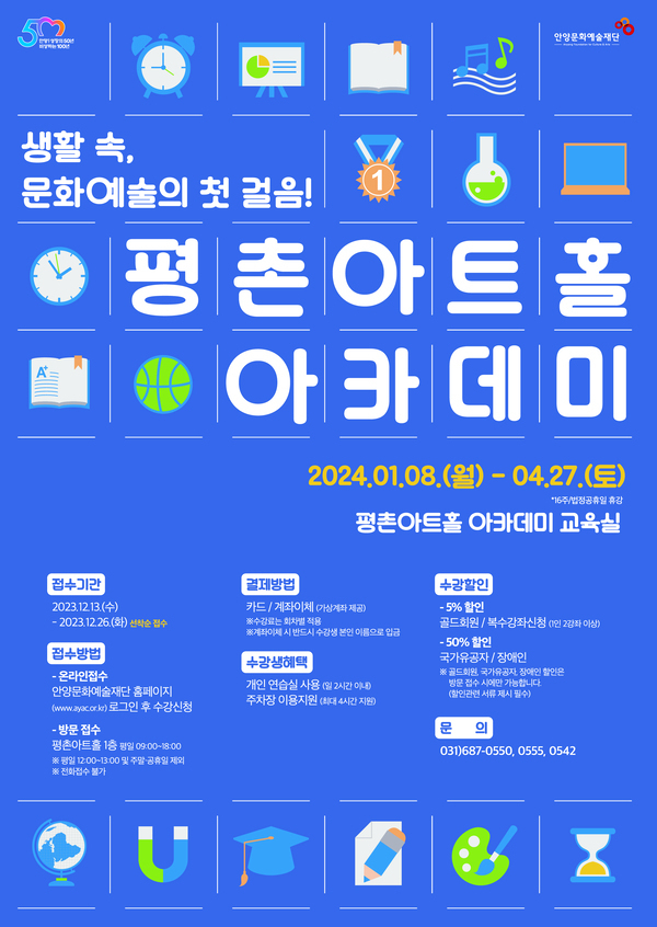 [광흥타임즈 = 조수제 기자] 안양문화예술재단은 평촌아트홀 아카데미 2024년도 1학기 수강생을 오는 13일부터 26일까지 모집한다.