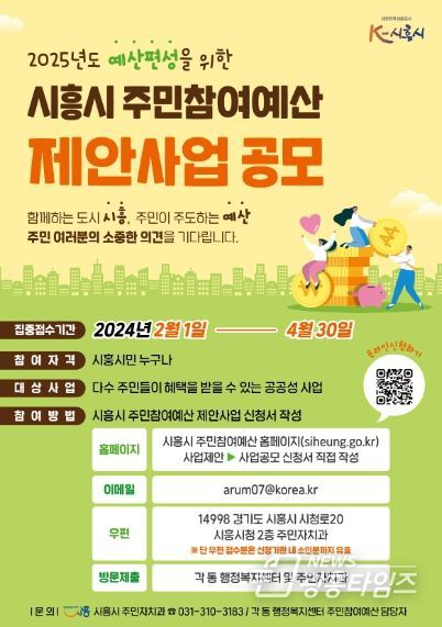 [광흥타임즈 = 조수제 기자] 시흥시는 2월 1일부터 4월 30일까지 주민들이 직접 사업을 제안하는 ‘시흥시 주민참여예산 제안사업’ 공모를 추진한다.