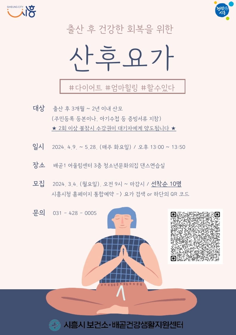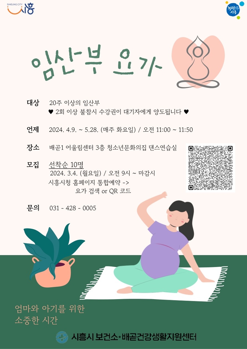 임산부 산전ㆍ산후 요가 교실은 총 8회에 걸쳐 진행된다. 분만에 좋은 호흡법, 순산 요가, 산후 회복에 좋은 동작 등 건강한 출산 및 회복을 위한 프로그램으로 구성됐으며 3월 4일부터 시흥시 통합예약 사이트를 통해 신청하면 된다.