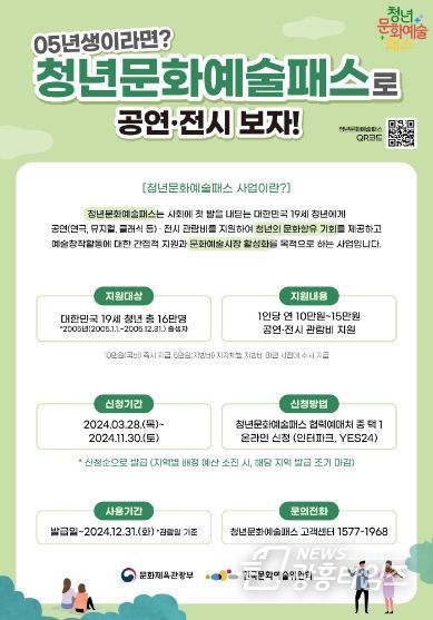 ‘청년문화예술패스’는 19세 청년들에게 순수예술 공연(연극, 뮤지컬, 클래식, 오페라, 발레, 무용, 합창, 국악 등)과 전시를 관람할 수 있는 지원금을 제공하는 사업이다.