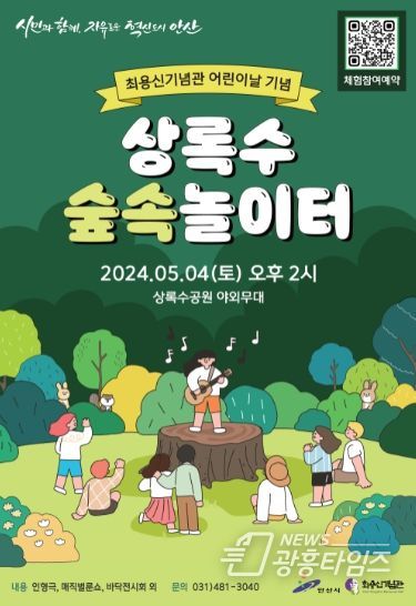 [광흥타임즈 = 조수제 기자] 안산시 최용신기념관은 다음달 4일 상록구 본오동에 소재한 상록수공원에서 어린이날을 맞아 유아·어린이 동반 가족을 위한 문화행사 ‘상록수 숲속 놀이터’를 개최한다고 15일 밝혔다.