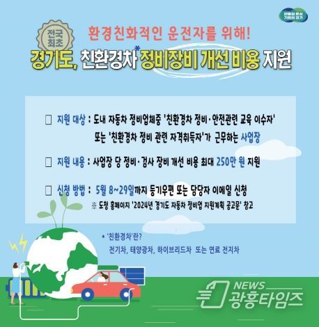 [광흥타임즈 = 조수제 기자] 경기도가 전국 최초로 하이브리드, 전기차 같은 환경친화적 자동차 정비·검사장비 개선 비용을 지원하는 ‘경기도 자동차정비업 지원사업’을 추진한다고 8일 밝혔다.