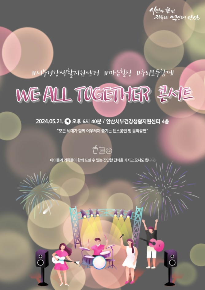 [광흥타임즈 = 조수제 기자] 안산시 단원보건소 서부건강생활지원센터는 5월 가정의 달을 맞아 마음힐링 음악회 ‘2024 We All Together 콘서트’를 오는 21일 개최한다고 18일 밝혔다.
