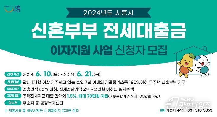 [광흥타임즈 = 조수제 기자] 시흥시는 올해도 신혼부부 가구를 대상으로 ‘신혼부부 전세대출금 이자지원 사업’을 시행한다고 밝혔다.