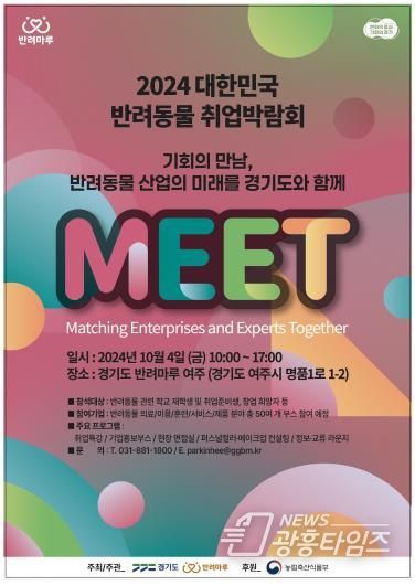[광흥타임즈 = 조수제 기자] 경기도가 오는 10월 4일 ‘동물보호의 날’ 제정을 기념해 국내 최대 반려동물 복합문화공간인 반려마루 여주에서 ‘2024 대한민국 반려동물 취업박람회’를 연다. 반려동물 산업 관련 취업박람회는 이번이 국내에서는 처음이다.