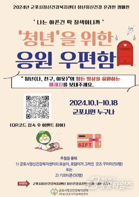 [광흥타임즈 = 조수제 기자] 군포시정신건강복지센터에서 ‘정신건강의 날(10월 10일)’을 앞두고 온라인 캠페인 ‘청년을 위한 응원우편함’을 진행한다.