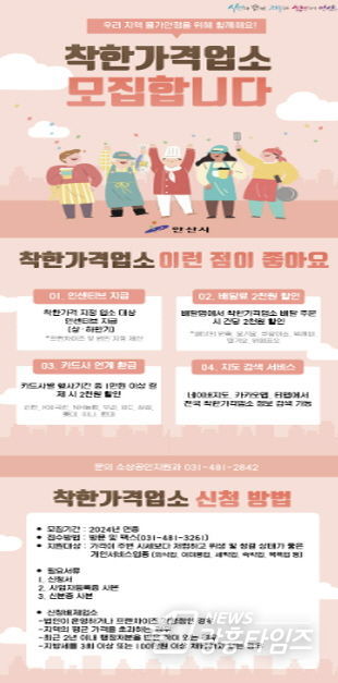 [광흥타임즈 = 조수제 기자] 안산시는 저렴한 가격과 친절한 서비스로 지역 물가안정에 기여하는 신규 착한가격업소를 수시 접수받는다고 14일 밝혔다.