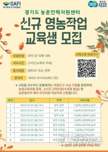 교육 수강은 포스터 내 QR코드 또는 경기도농촌인력지원센터를 통해 무료로 신청할 수 있으며, 일정별 선착순 10명 모집 시 접수 마감된다.