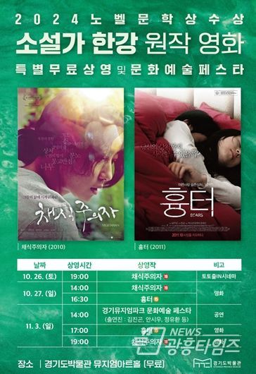 [광흥타임즈 = 조수제 기자] 경기문화재단 경기도박물관은 2024년 한강 작가의 노벨문학상 수상을 기념하여, 한강의 소설을 원작으로 한 영화 특별전을 개최한다. 이번 영화 특별전은 한강의 대표 소설 중 영화화된 두 작품을 상영하며, 소설 속에 담긴 깊은 이야기와 감동을 시각적으로 재해석하는 기회가 될 것이다.