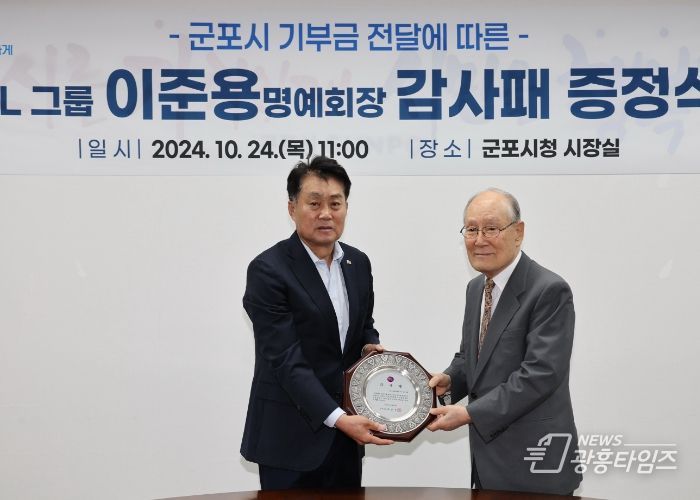[광흥타임즈 = 조수제 기자] 하은호 군포시장은 25일 시장실에서 DL그룹 이준용 명예회장에게 감사패를 전달했다.