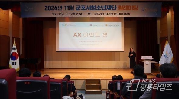 [광흥타임즈 = 조수제 기자] (재)군포시청소년재단은 지난 1일, 청소년수련관 청소년어울림극장에서 재단 월례미팅의 일환으로 AX 마인드 셋’ 특강을 열어 재단 임직원들의 뜨거운 호응을 얻었다. 이번 특강은 인공지능(AI)에 대한 이해를 높이고, 빠르게 변화하는 디지털 시대에 발맞춰 청소년들이 AI 관련 지식과 역량을 갖출 수 있도록 돕기 위해 마련됐다.