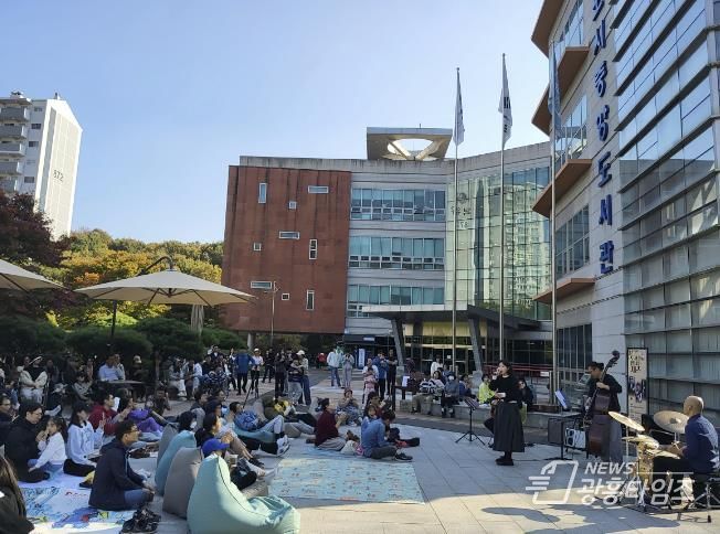 [광흥타임즈 = 조수제 기자] 지난 11월 2일 수리산 단풍이 절정을 이룬 가운데 군포시중앙도서관 야외 광장에서 열린 '도서관에서 만나는 재즈' 공연이 성황을 이루며 막을 내렸다.