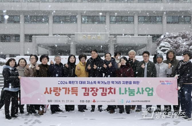 [광흥타임즈 = 조수제 기자] 군포시와 군포시지역사회보장협의체는 김장철에 맞추어 11월 27일(수) 오전 10시 30분 군포시청 앞 광장에서 관내 기초생활수급 독거노인과 노인가구 지원을 위한 ‘사랑의 김장김치나눔’ 전달식을 가졌다.