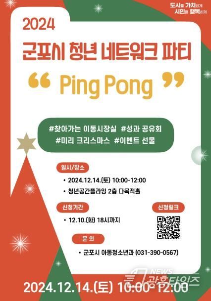 [광흥타임즈 = 조수제 기자] 군포시는 오는 12월 14일, 올해 10월 개관한 군포시 청년공간 플라잉에서 군포시 청년들과 청년공간 플라잉 이용자 및 운영자들과 함께 '2024년 이동시장실 · 청년활동 성과공유회'를 개최한다고 밝혔다.