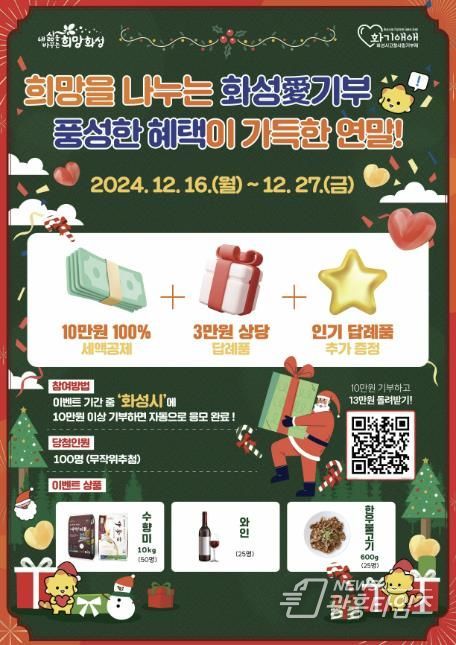 이벤트는 16일부터 27일까지 진행되며, 화성시에 10만 원 이상 기부한 참여자는 자동으로 응모돼 추첨을 통해 100명에게 수향미, 와인, 한우불고기 등 3만 원 상당의 답례품이 추가로 제공된다.