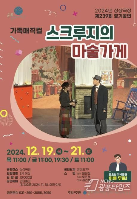 [광흥타임즈 = 조수제 기자] 군포문화재단 군포시평생학습원은 연말을 맞아 크리스마스에 어울리는 공연 ‘스크루지의 마술가게’를 2024년도 상상극장 정기공연의 마지막 공연으로 진행한다.