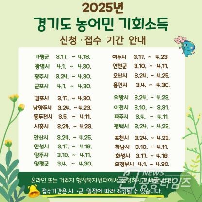 신청은 해당 시군이나 읍면동 행정복지센터를 방문하거나, 경기도 기회소득농어민 통합지원시스템을 통해 가능하다.