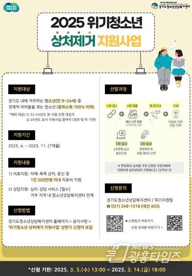 지원 대상은 중위소득 100% 이하 요건을 충족하는 경기도 거주 9세 이상 24세 이하 위기청소년이다. 상반기 접수는 오는 14일까지 경기도청소년상담복지센터 누리집에서 신청할 수 있으며, 청소년 본인 외 보호자의 대리 신청도 가능하다.