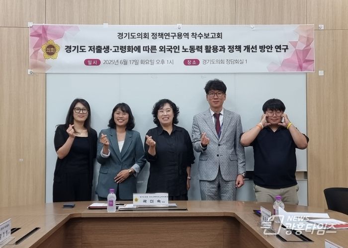 [광흥타임즈 = 조수제 기자] 경기도의회 곽미숙 의원(국민의힘, 고양6)은 의원연구단체 ‘행복한 경기도민을 위한 정책발굴 연구회’ 회장으로서, 지난 2025년 6월 17일 '경기도 저출생·고령화에 따른 외국인 노동력 활용과 정책 개선 방안 연구' 착수보고회를 개최했다.