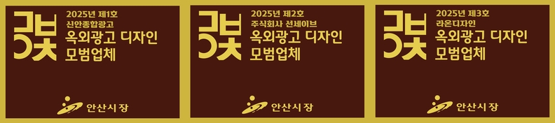 올해 선정된 모범업체는 ▲신안종합광고 ▲주식회사 선세이브 ▲라온디자인이다. 선정 모범업체들은 오는 27일 ‘2025년 옥외광고사업자 보수교육’에서 3년간 유효한 인증 동판을 부여받게 되며, 안산시나 상록구·단원구 누리집 등에서 홍보지원을 받게 된다.