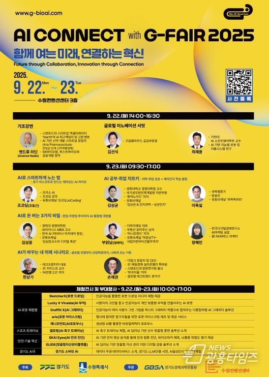 [광흥타임즈 = 조수제 기자] 경기도는 22일부터 23일까지 수원컨벤션센터에서 인공지능(AI)과 실생활의 융합을 주제로 한 ‘AI Connect with G-FAIR 2025(에이아이 커넥트 위드 지페어)’를 개최한다.