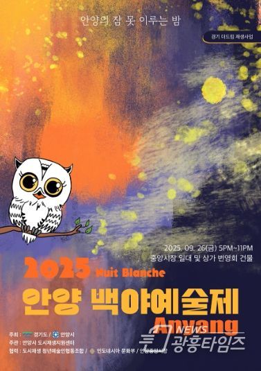 [광흥타임즈 = 조수제 기자] 안양시는 이달 26일 오후 5시부터 11시까지 만안구 안양4동 안양중앙시장에서 청년들이 즐길 수 있는 ‘안양 백야예술제(Nuit Blanche Anyang)’를 개최한다고 19일 밝혔다.