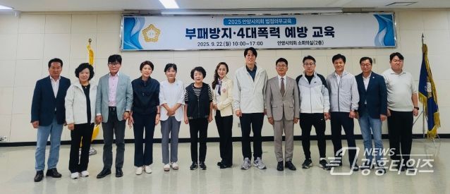 [광흥타임즈 = 조수제 기자] 안양시의회는 지난 22일 시의회 소회의실에서 시의원과 사무국 직원을 대상으로 ‘부패방지 및 4대폭력 예방 교육’을 진행했다. 이번 교육은 법정의무교육으로, 청렴 의식 함양과 4대폭력(성희롱, 성폭력, 성매매, 가정폭력)에 대한 예방 의식 고취를 위해 마련됐다.