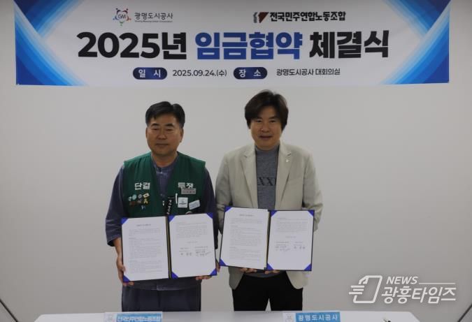 [광흥타임즈 = 조수제 기자] 광명도시공사는 공사 교섭대표노조인 전국민주연합노동조합 광명지부와 노사 교섭위원들이 함께 참석한 가운데 2025년 임금협약을 체결했다.