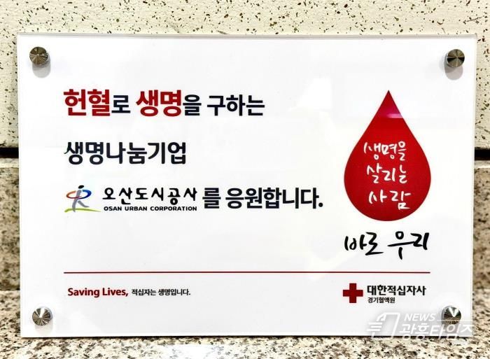 [광흥타임즈 = 조수제 기자] 오산도시공사는 지난 25일 대한적십자사 경기혈액원으로부터 ‘생명나눔기업’으로 선정되어 현판식을 진행했다고 밝혔다.