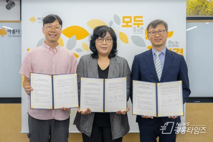 지난달 30일 서울 종로구 아름다운재단에서 열린 협약식에는 공정식 경기도 사회혁신경제국장, 김진아 아름다운재단 사무총장, 김정태 MYSC 대표가 참석했다.