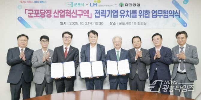 [광흥타임즈 = 조수제 기자] 군포시는 2일 군포시청에서 한국토지주택공사(LH), ㈜유한양행과 ‘군포당정 산업혁신구역’ R·D 전략기업 유치를 위한 업무협약을 체결했다고 밝혔다.
