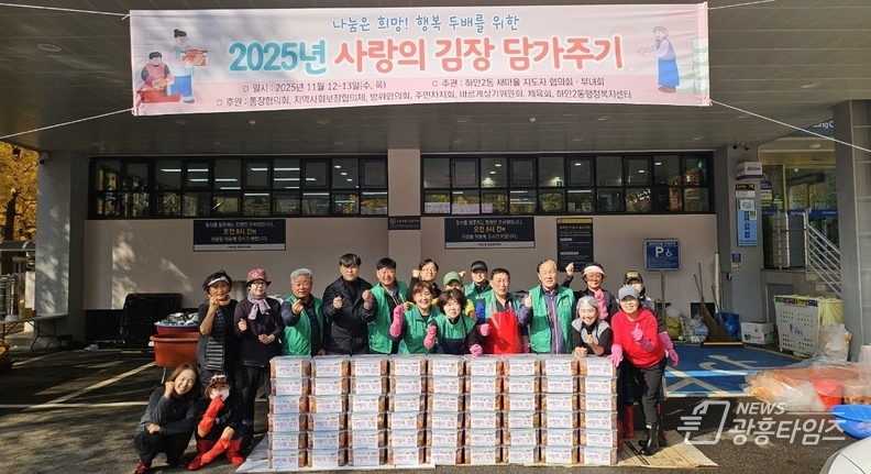 [광흥타임즈 = 조수제 기자] 광명시 하안2동 새마을지도자협의회·부녀회는 지난 12일부터 13일까지 이틀간 하안2동 행정복지센터 주차장에서 ‘사랑의 김장 담가주기’ 행사를 열었다.