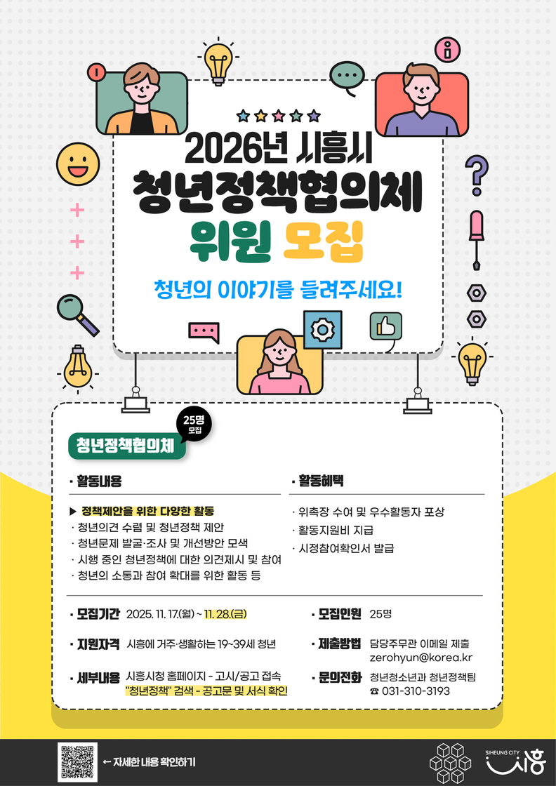 [광흥타임즈 = 조수제 기자] 시흥시는 2026년 한 해 동안 활동할 제10기 시흥시 청년정책협의체 신규 위원 25명을 공개 모집한다.