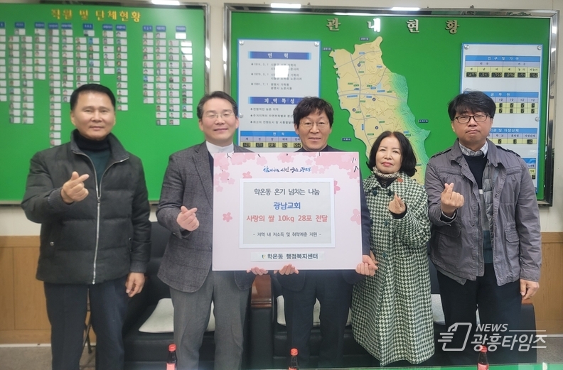 [광흥타임즈 = 조수제 기자] 광명시 학온동 행정복지센터는 지난 18일 추수감사절을 맞아 학온동 광남교회로부터 교인들이 정성껏 모은 쌀 10kg들이 28포를 전달받았다.