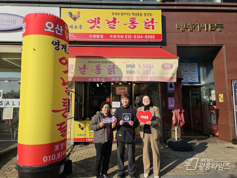 옛날통닭 수청동점은 매월 관내 저소득 가정에 통닭 30마리를 후원하며 꾸준한 나눔을 실천하고 있다. 특히 추운 계절 따뜻한 한 끼를 전하는 후원은 어려운 이웃에게 더욱 큰 위로가 되고 있다.