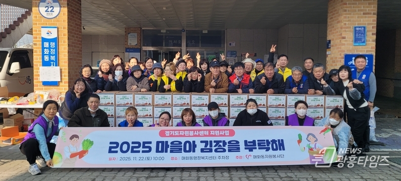 [광흥타임즈 = 조수제 기자] 시흥시 매화동 자원봉사지원단 주관으로 지난 11월 22일 매화동 행정복지센터 앞마당에서 ‘마을아! 김장을 부탁해’ 행사가 유관 단체와 주민 100여 명이 참여한 가운데 성황리에 열렸다.