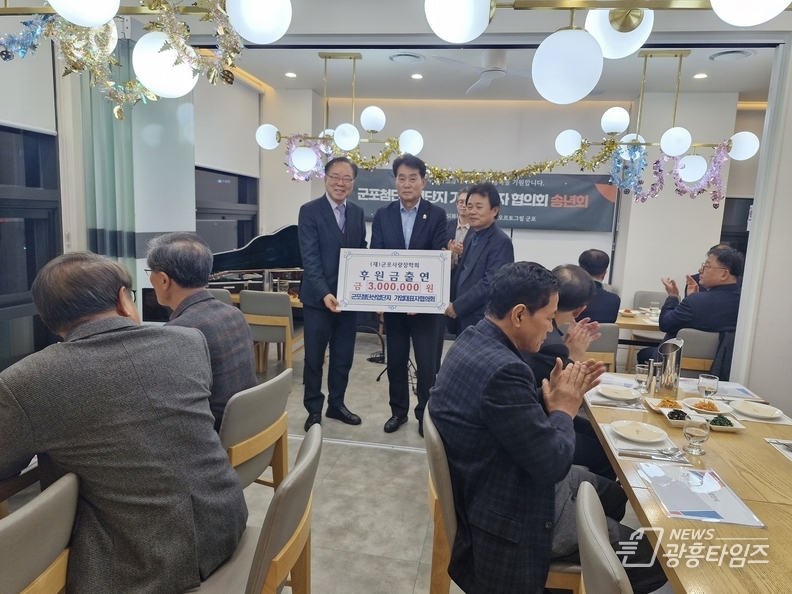 [광흥타임즈 = 조수제 기자] 군포첨단산업단지 기업대표자협의회는 지난 11월 25일 첨단산업단지 내 한 음식점에서 2025년 한 해를 마무리하며 지역 인재 양성에 써달라며 후원금 300만원을 (재)군포사랑장학회에 기탁했다.
