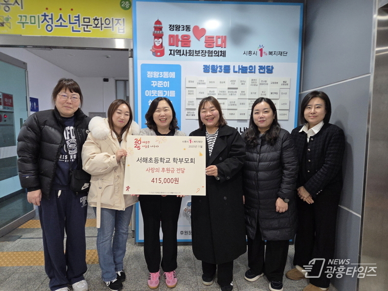 [광흥타임즈 = 조수제 기자] 시흥시 정왕3동 행정복지센터에 지난 11월 26일 서해초등학교 학부모회가 방문해 ‘놀통 페스티벌’ 부스 운영 수익금을 취약 계층을 위해 정왕3동 지역사회보장협의체에 기부했다.