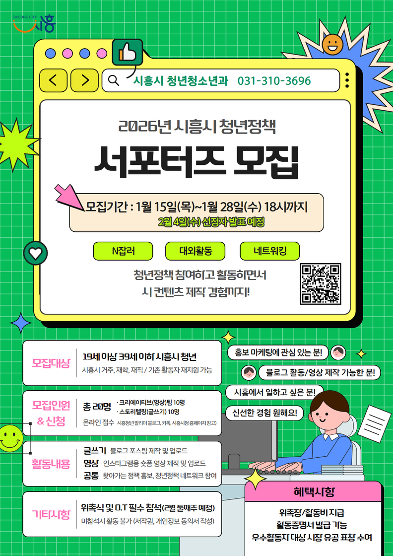[광흥타임즈 = 조수제 기자] 시흥시는 청년의 눈높이에서 정책 정보를 전달하고 현장의 목소리를 시정에 반영하기 위해 ‘2026년 시흥시 청년정책 서포터즈’를 1월 15일부터 28일까지 모집한다.