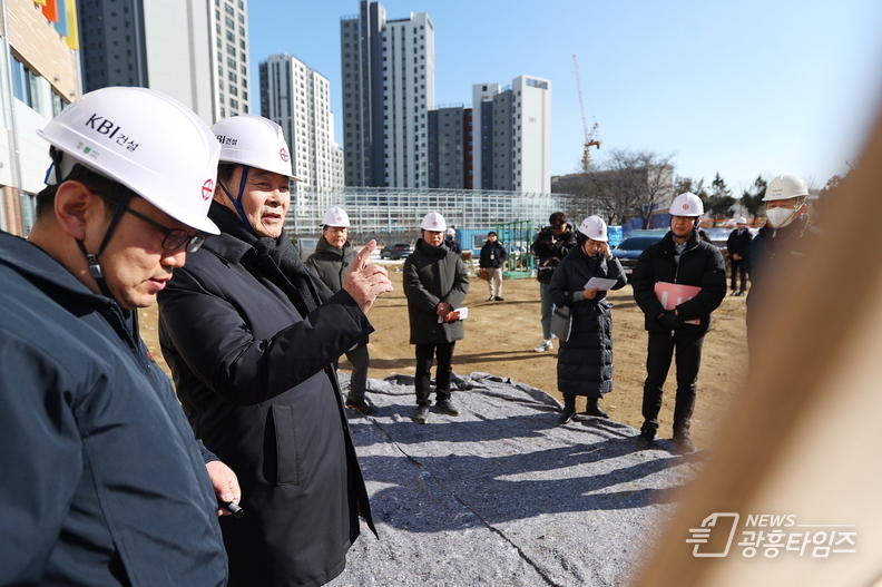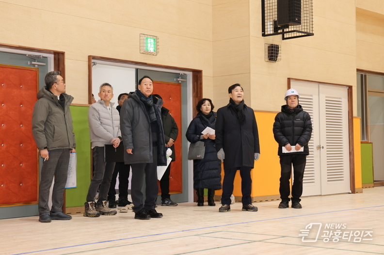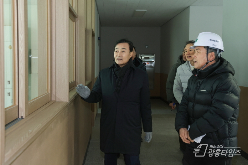 이날 김성제 시장은 관계자로부터 공정 진행 상황과 학급편성 등에 대한 학교 현황을 보고 받은 뒤, 학생 안전을 최우선으로 하는 시설 점검을 진행했다.