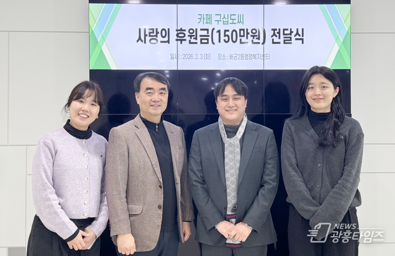 [광흥타임즈 = 조수제 기자] 시흥시 배곧2동 행정복지센터에 지난 2월 3일 카페 구십도씨가 방문해 사랑의 후원금 150만 원을 전달하며 지역 내 취약계층을 위한 나눔 실천에 나섰다.