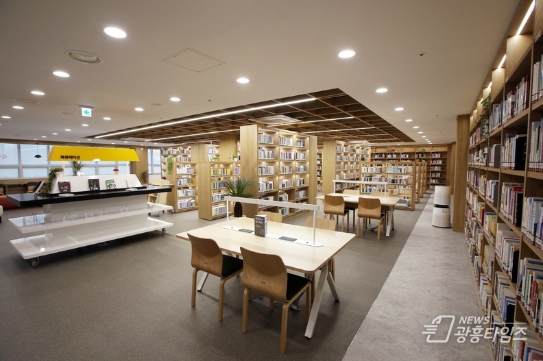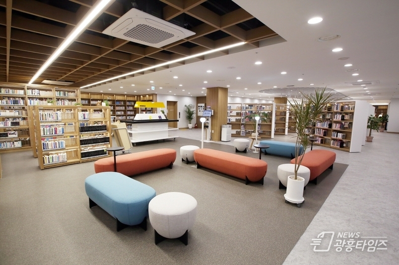 특히, 기존의 높은 밀집 서가로 인해 좁고 어두운 공간을 개방형의 낮은 서가와 세련된 테이블·소파 등을 배치해 개선하고, 여기에 격자 천장·조명 시공을 더해 밝고 현대적인 분위기의 도서관으로 탈바꿈시켰다.