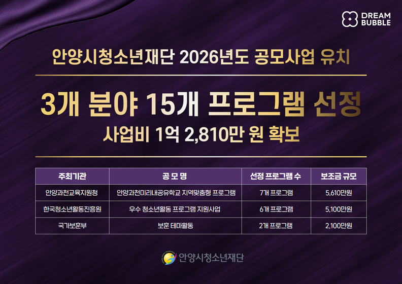 [광흥타임즈 = 조수제 기자] 안양시청소년재단은 2026년 국가 및 공공기관, 교육청 등이 추진하는 주요 공모사업 3개 분야에서 15개 프로그램이 선정되어 총 1억 2,810만 원 규모의 사업비를 확보했다고 3일 밝혔다.