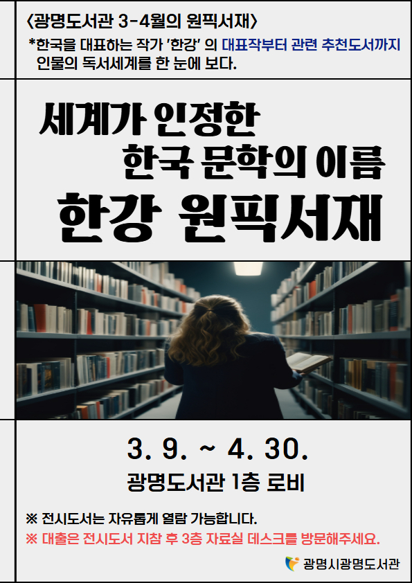 전시는 광명도서관 1층 로비에서 진행하며 누구나 자유롭게 열람할 수 있다. 전시 도서의 대출을 원하는 경우 3층 자료실에서 관외 대출도 가능하다.