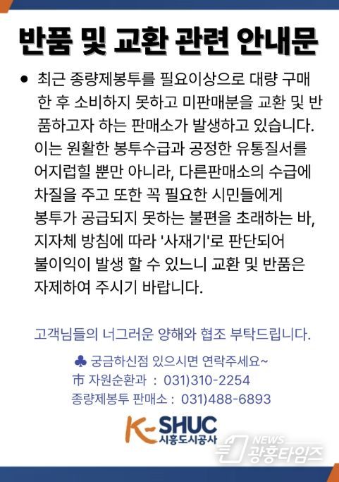 특히 시흥도시공사에는 종량제봉투 환불 관련 문의가 쇄도하고 있으나, 현행 규정상 종량제봉투 환불은 불가하다는 점을 안내하고 있다. 시는 판매소와 시민을 대상으로 올바른 유통 절차와 환불 불가 기준을 지속적으로 안내하고 있다.