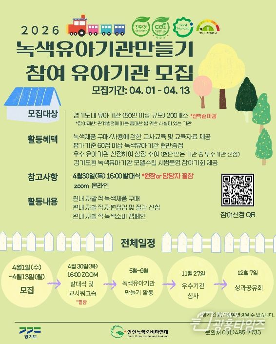 [광흥타임즈 = 조수제 기자] 경기도가 아이들이 생활 속에서 올바른 녹색 소비 습관을 가질 수 있도록 돕는 ‘2026년 녹색유아기관만들기’ 참여 기관 200곳을 4월 13일까지 모집한다.
