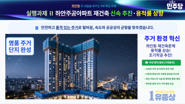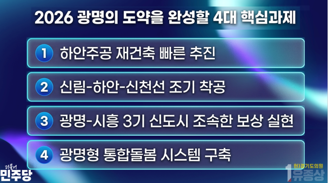 이번 공약의 핵심은 ▲신천~하안~신림선 조기 착공 ▲하안주공아파트 재건축 신속 추진 ▲광명·시흥 3기 신도시 보상 조속 이행 ▲광명형 통합돌봄 시스템 구축 등이다.