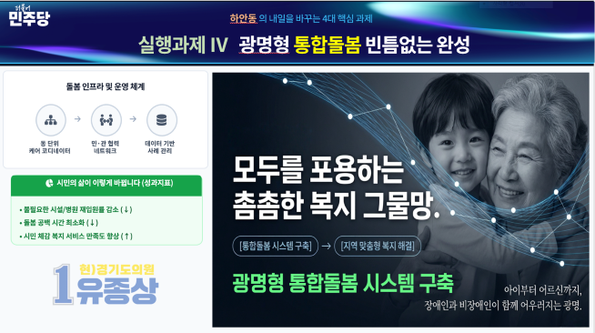 동 단위 케어 코디네이터 배치, 민·관 협력 네트워크 강화, 데이터 기반 사례관리 체계를 통해 돌봄 사각지대를 최소화하겠다는 계획이다. 이를 통해 시민 누구나 필요할 때 쉽게 이용할 수 있는 촘촘한 복지망을 구축하겠다고 밝혔다.